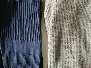 Die blauen (zweifarbig blau, verschieden gerippt) werde ich zu einem karamel-farbenen Blazer oder Strickjacke tragen, die grauen passen perfekt zum neuen Norweger-Pulli-Look...Bilder folgen... |